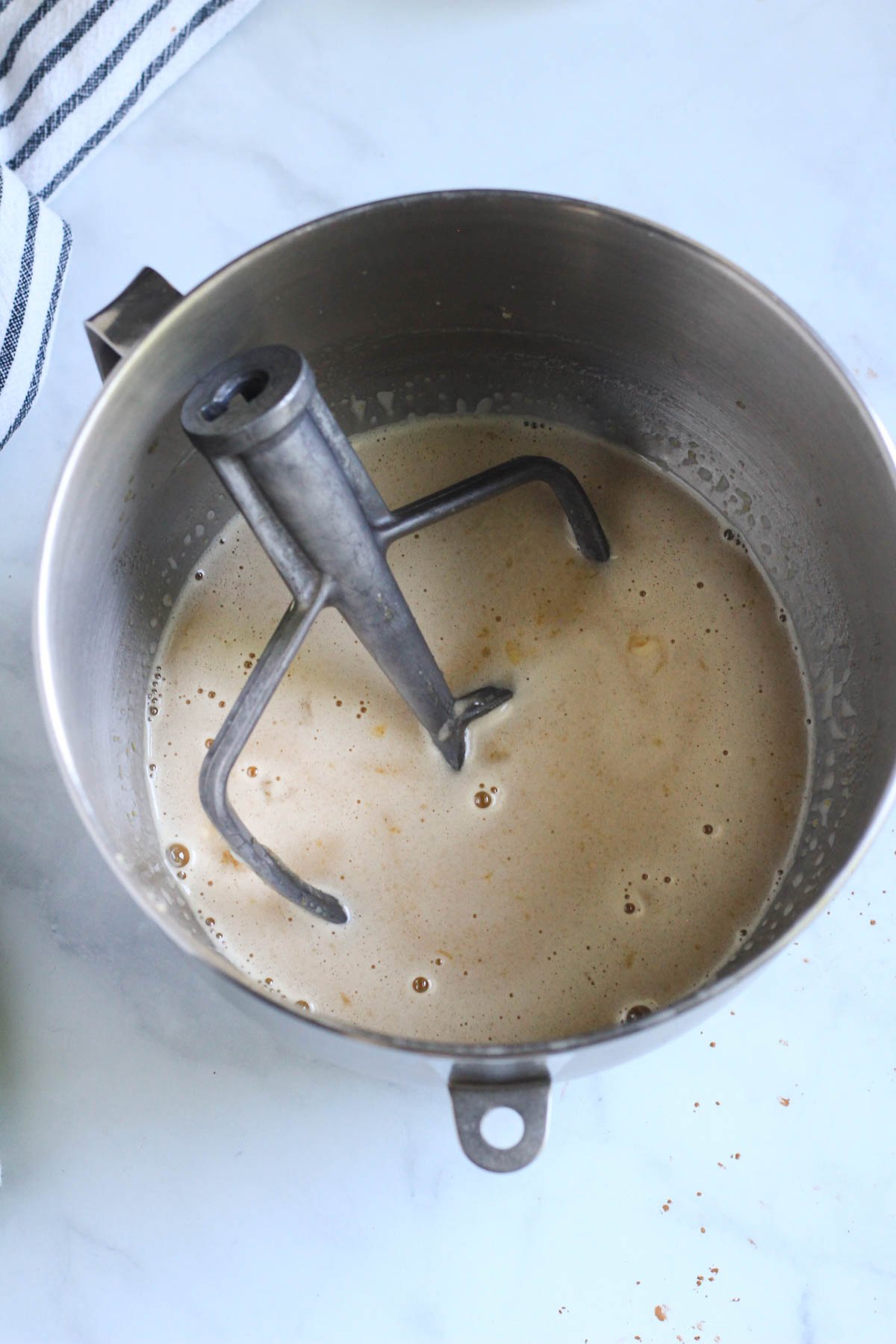 - Cream oil and sugar: In the base of a stand mixer, beat together granulated sugar, brown sugar, and vegetable oil.