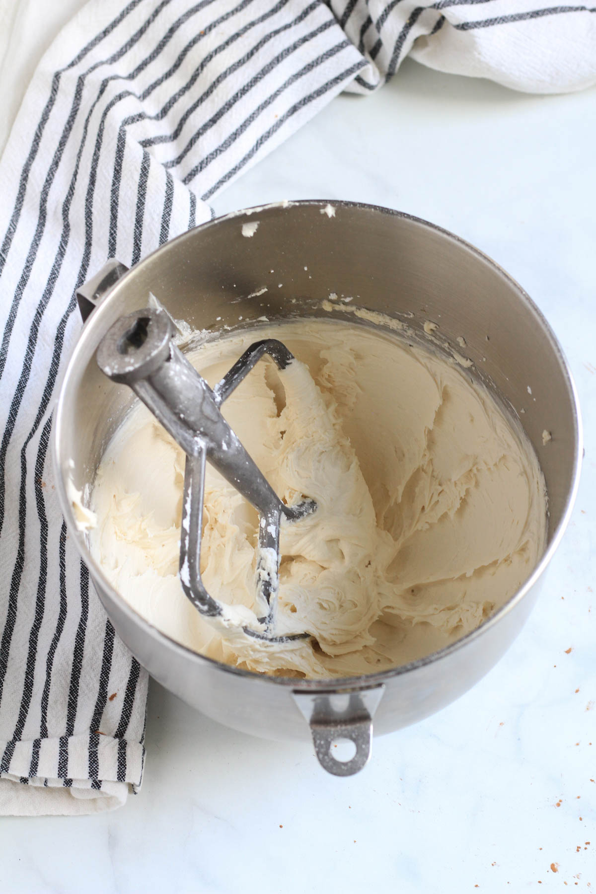 - Cream butter and sugar: In the base of a stand mixer, beat together plant-based butter and powdered sugar until light and fluffy.