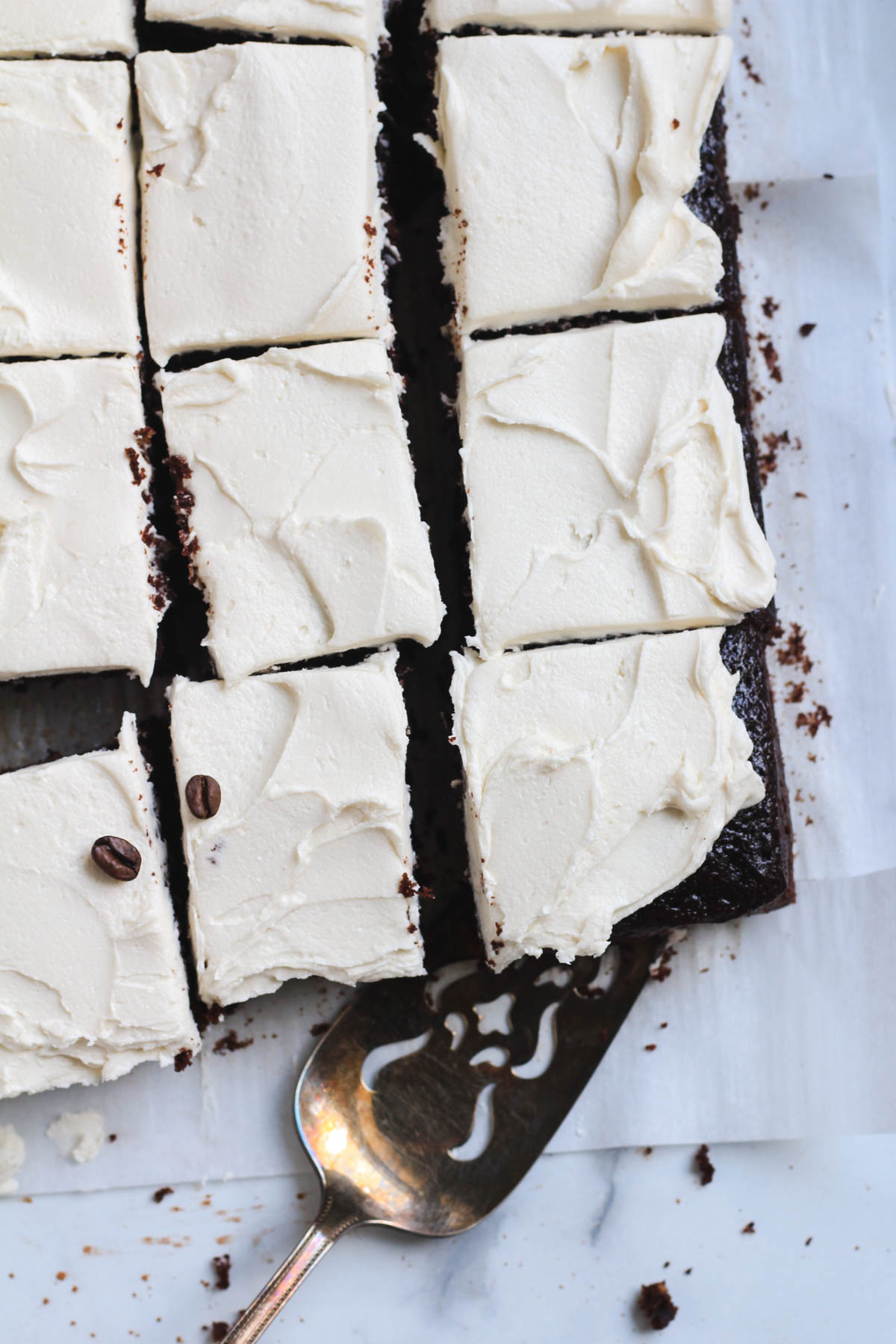 - Moist, tender cake. From the oil, to the non-dairy buttermilk, to the warm coffee, everything is working to make this a melt in your mouth cake.
