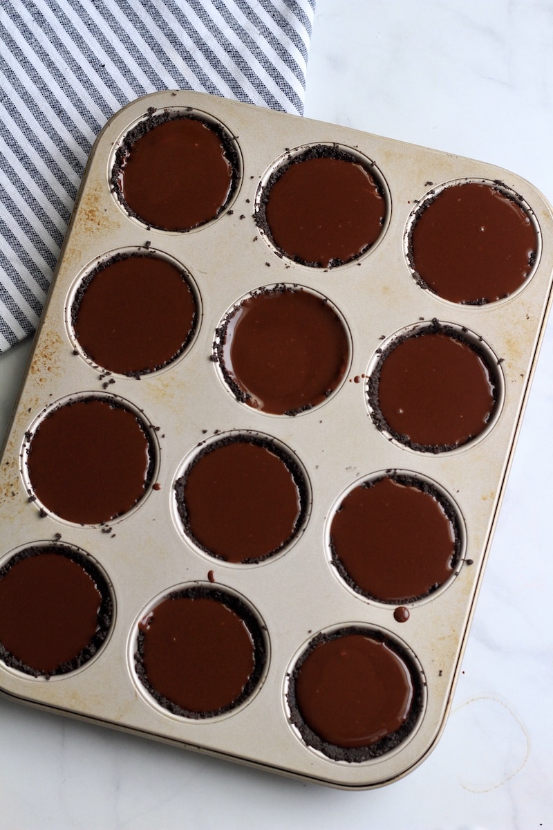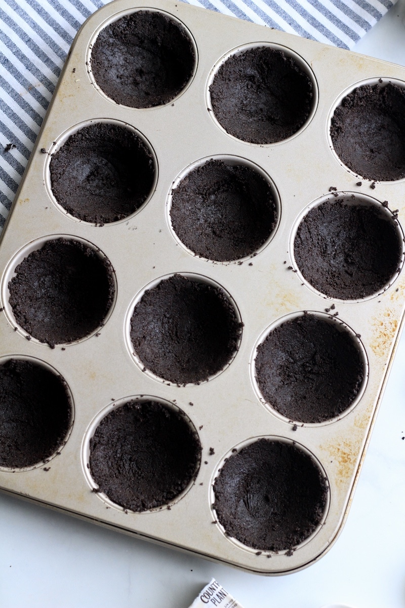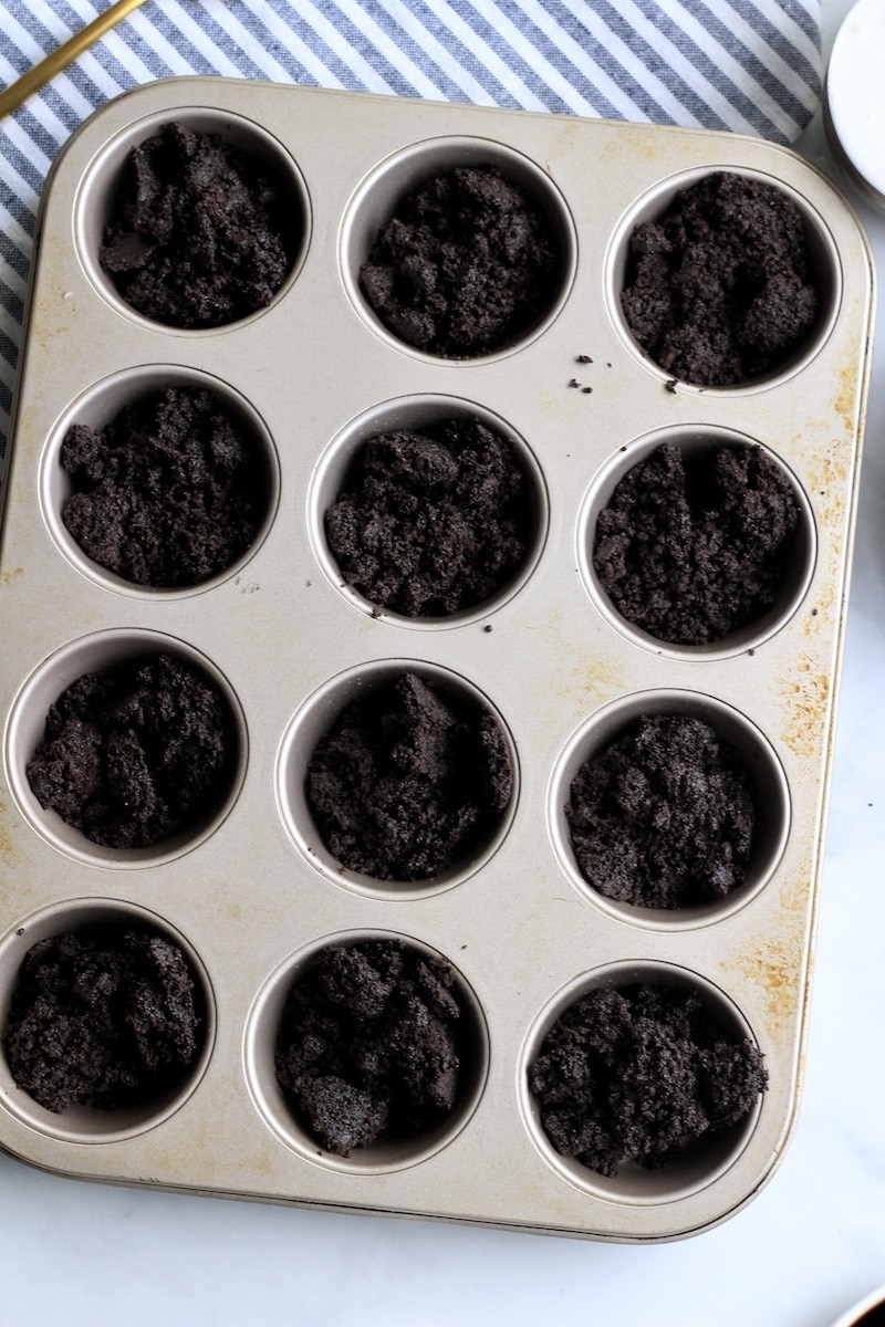 • Press into muffin tins. Smash the Oreo crust into the base and up the sides of each muffin tin. The crust won’t go all the way to the top of each muffin cup.