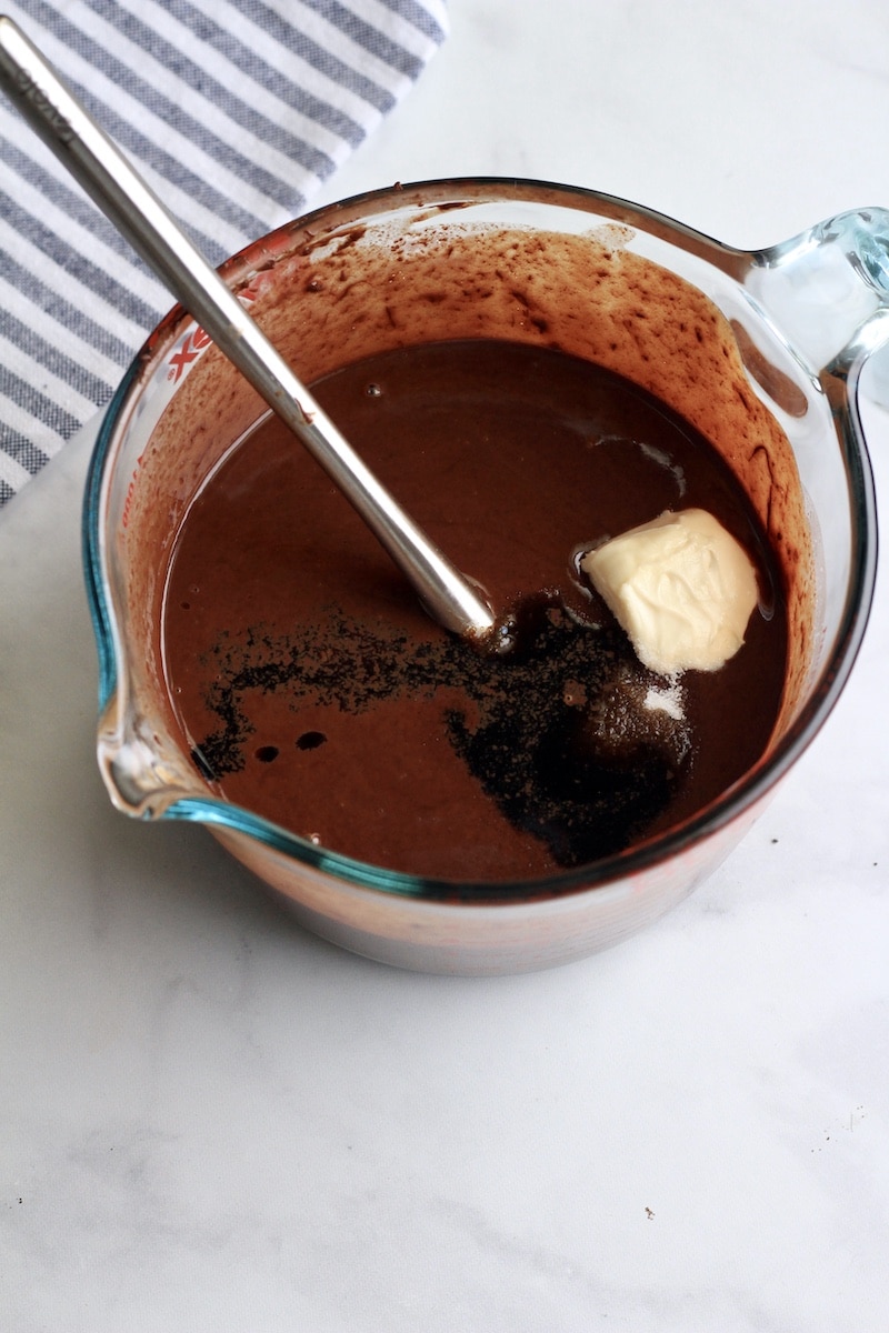 8. Once melted, add plant-based butter, vanilla, and sugar. Stir until smooth.