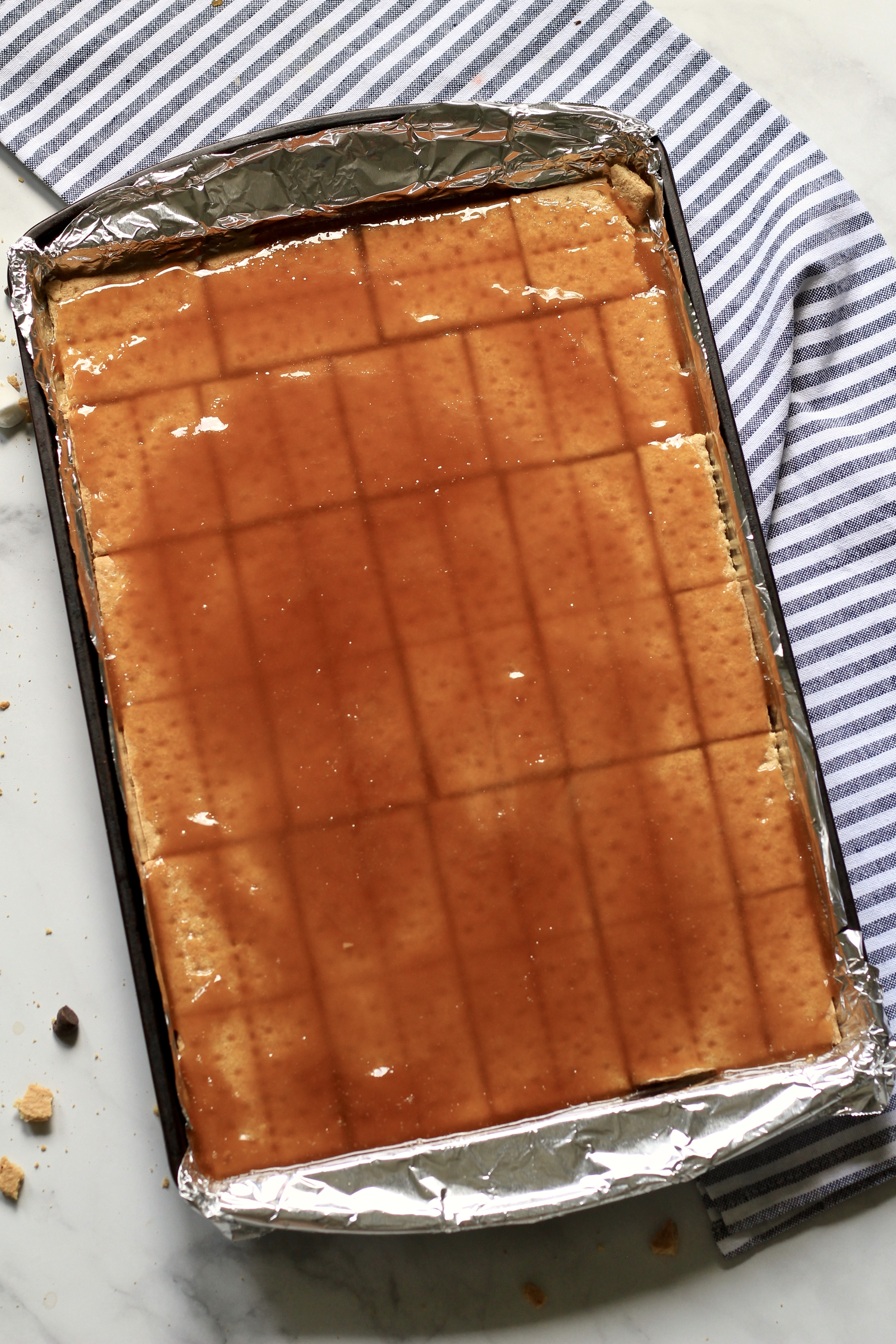 - Pour + Spread Toffee: Pour the toffee over the graham cracker layer and spread with a rubber spatula to coat the graham crackers. Bake in preheated oven for 5 minutes.